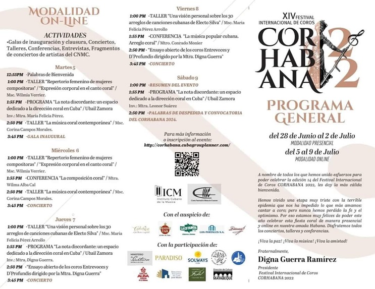 De igual forma, aún no culmina el XV Festival Internacional de Coros CORHABANA 2022. Su modalidad online, sesionará hasta este 9 de julio, donde se debatirán temas como la expresión corporal en el canto coral, la música coral contemporánea, la  música popular cubana, la música coral para niños y jóvenes y otros dedicados a cómo hacer una correcta selección de repertorios para un programa de concierto.