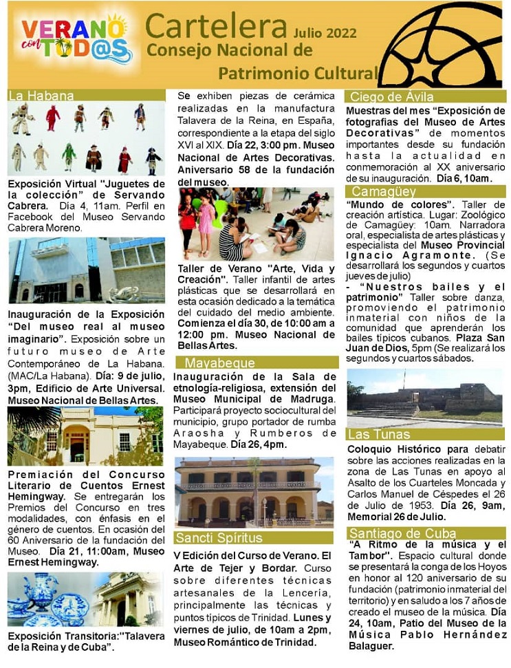 El Coro Nacional dirigido por la maestra Digna Guerra, brindará un concierto en la Biblioteca Nacional José Martí el 23 de julio a las 4 de la tarde y el pianista Huberal Herrera, estará presentándose en el Museo Nacional de la Música a la misma hora el día 27.   .