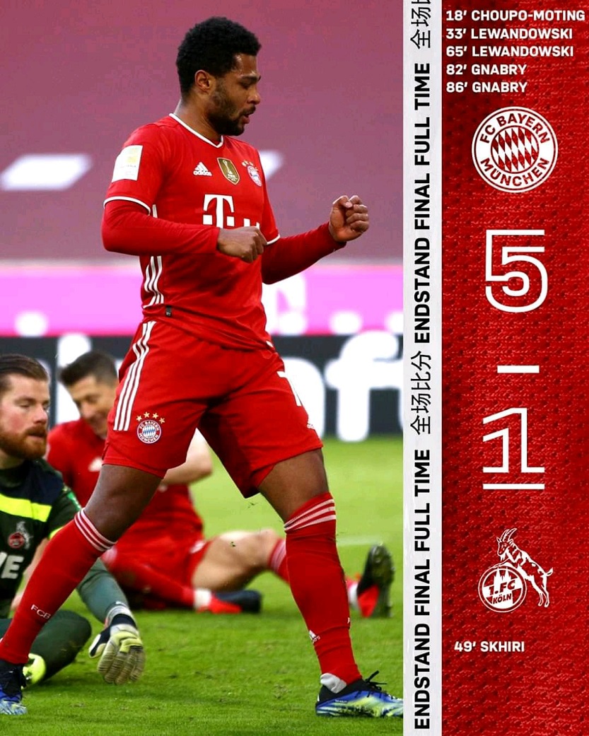 En partido correspondiente a la jornada 23 de la Bundesliga alemana, los Bávaros impusieron su favoritismo en el Allianz Arena gracias al primer gol de Eric-Maxim Choupo-Moting con la camiseta del Bayern, mientras que Serge Gnabry y  Robert Lewandowski perforaron par de veces las redes de la portería rival.