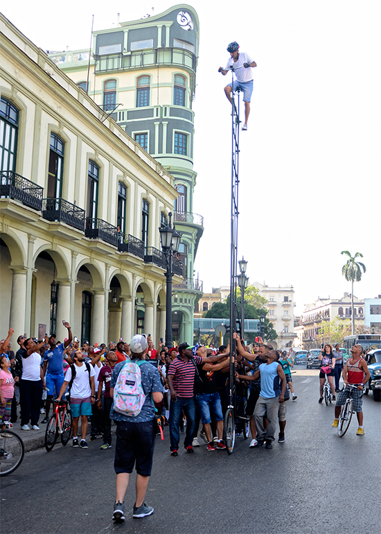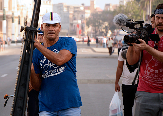 A pocos minutos de las 9:00 de la mañana, aparecieron por una de las calles que desembocan frente al Capitolio habanero, el hombre y su bicicleta gigante. Ayudándolo a transportarla y filmando todos los incidentes un grupo de colaboradores cubanos y extranjeros que inspiraban a Félix Ramón Guirola a imponer este jueves el récord Guinness de montar en la bici más alta del mundo.
