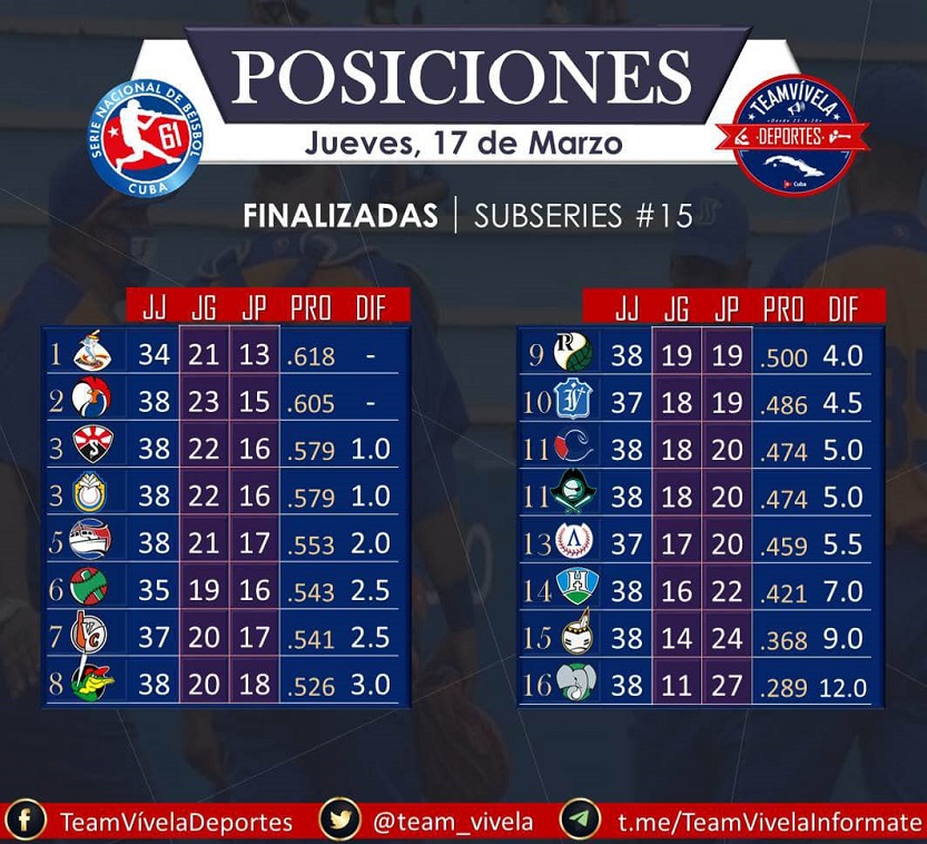 Así de ajustada anda la tabla de posiciones, en la que Holguín, ocupante del puesto 14, sigue soñando con una racha, posible y en sus manos, que lo catapulte, pues también son cuatro rayas las que median entre ese equipo y los matanceros, alojados en el último lugar con pasaje a la postemporada.
