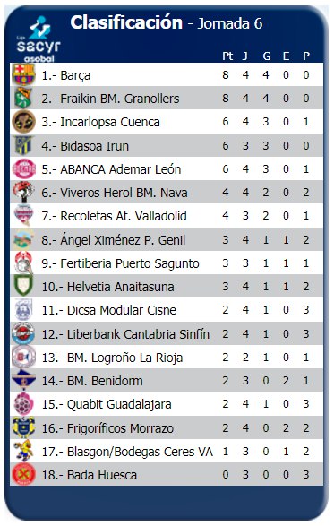 Tabla 2: Clasificación General Liga Asobal (Jornada 6)