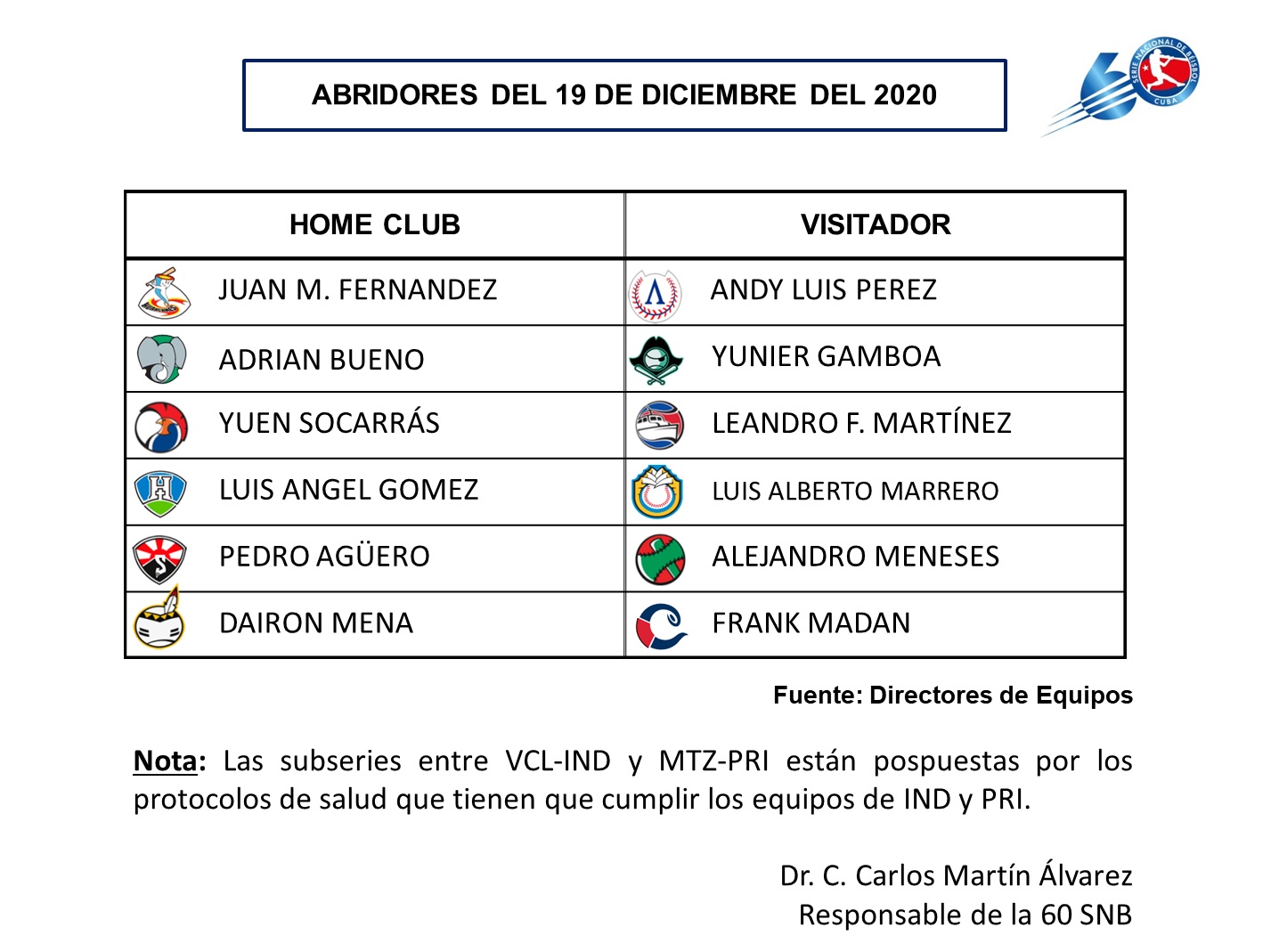Por lo demás, Granma conservó el liderazgo en el ordenamiento, pese a que perdió otro de sus mejores jugadores, el tercer bate y máximo impulsador de carreras del torneo (74), Guillermo Avilés, quien fichó con el club Cañero de los Mochis de la liga Arco del Pacífico en México.