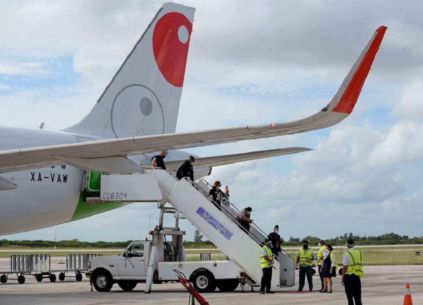 La aerolínea mexicana Viva Aerobus inaugura la reapertura de las operaciones del Aeropuerto de Camagüey Ignacio Agramonte Loynaz, con la máxima observancia de los protocolos de control sanitario internacional, dispuesto para evitar la propagación del nuevo coronavirus, en Camagüey. (Rodolfo Blanco Cué/ACN)