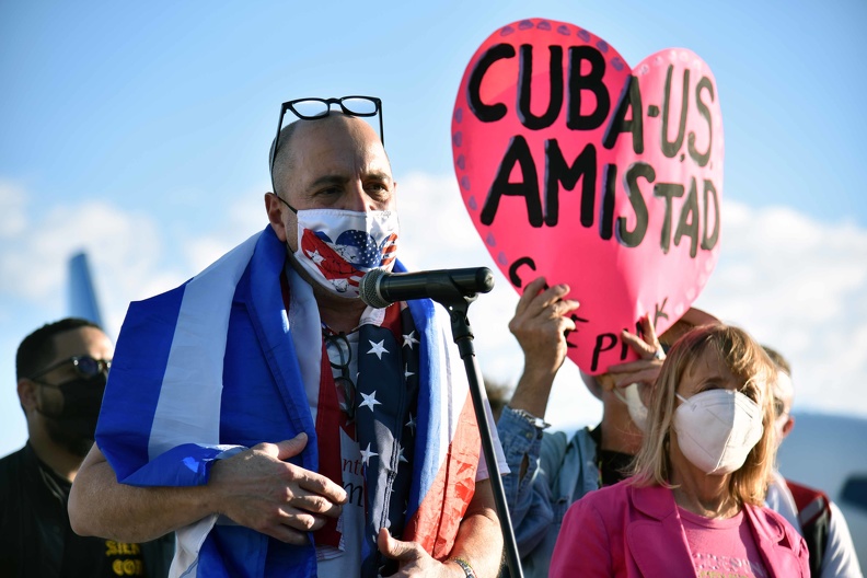 arlos Lazo, líder de la organización estadounidense de solidaridad Puentes de Amor, interviene en el recibimiento en el Aeropuerto Internacional José Martí, en La Habana, del arribo de un cargamento de leche en polvo donado por las organizaciones estadounidense Puentes de Amor, The People’s Forum y Code Pink, al Centro Memorial Martin Luther King con destinos a hospitales pediátricos de la capital. Cuba, 15 de enero de 2022. ACN FOTO/Omara GARCÍA MEDEROS