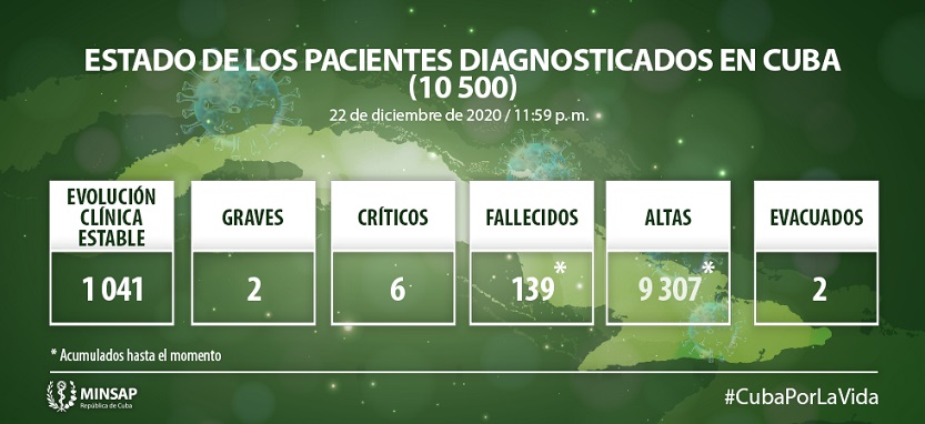 - Ciudadano cubano de 20 años de edad, del municipio Cienfuegos, provincia Cienfuegos. Contacto de caso confirmado. Se mantienen en vigilancia 10 contactos.