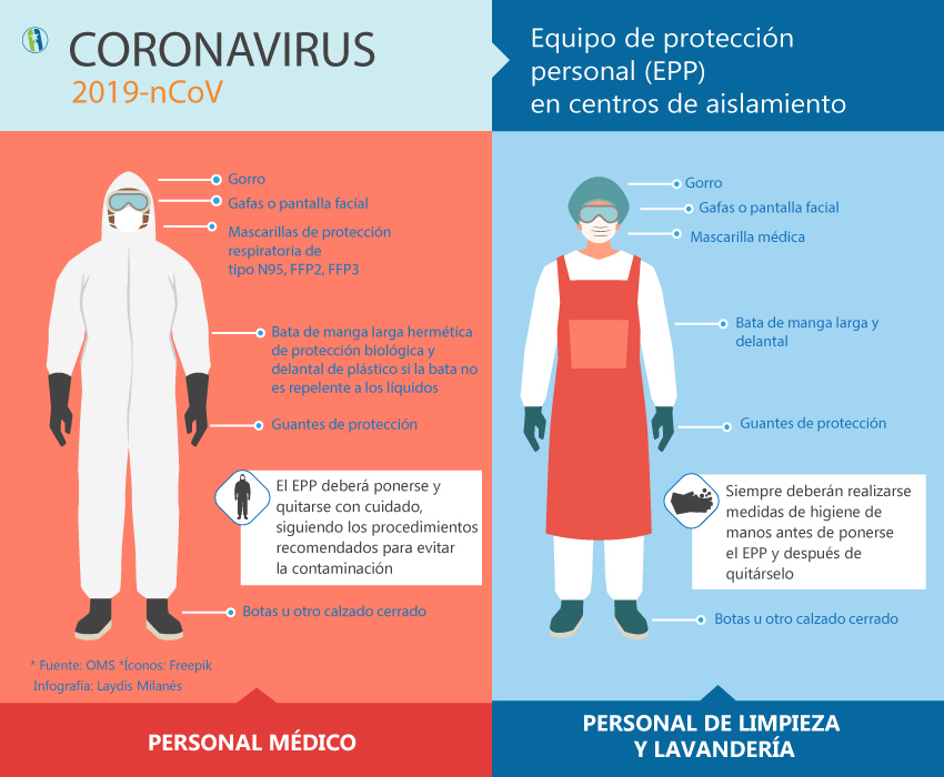 La Covid-19 se transmite por contacto y por gotículas, de ahí que la Organización Mundial de la Salud y el Ministerio de este sector en nuestro país, recomienden a modo general mascarilla clínica, guantes, bata de manga larga y protección ocular (gafas o pantalla facial). En dependencia del riesgo de contagio, será el EPP que se utilice.