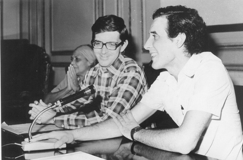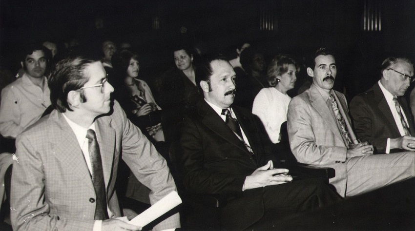 Durante la proyección de un audiovisual sobre ciencia, a su izquierda el Dr. Wilfredo Torres, director del CNIC y luego presidente de la Academia de Ciencias.
