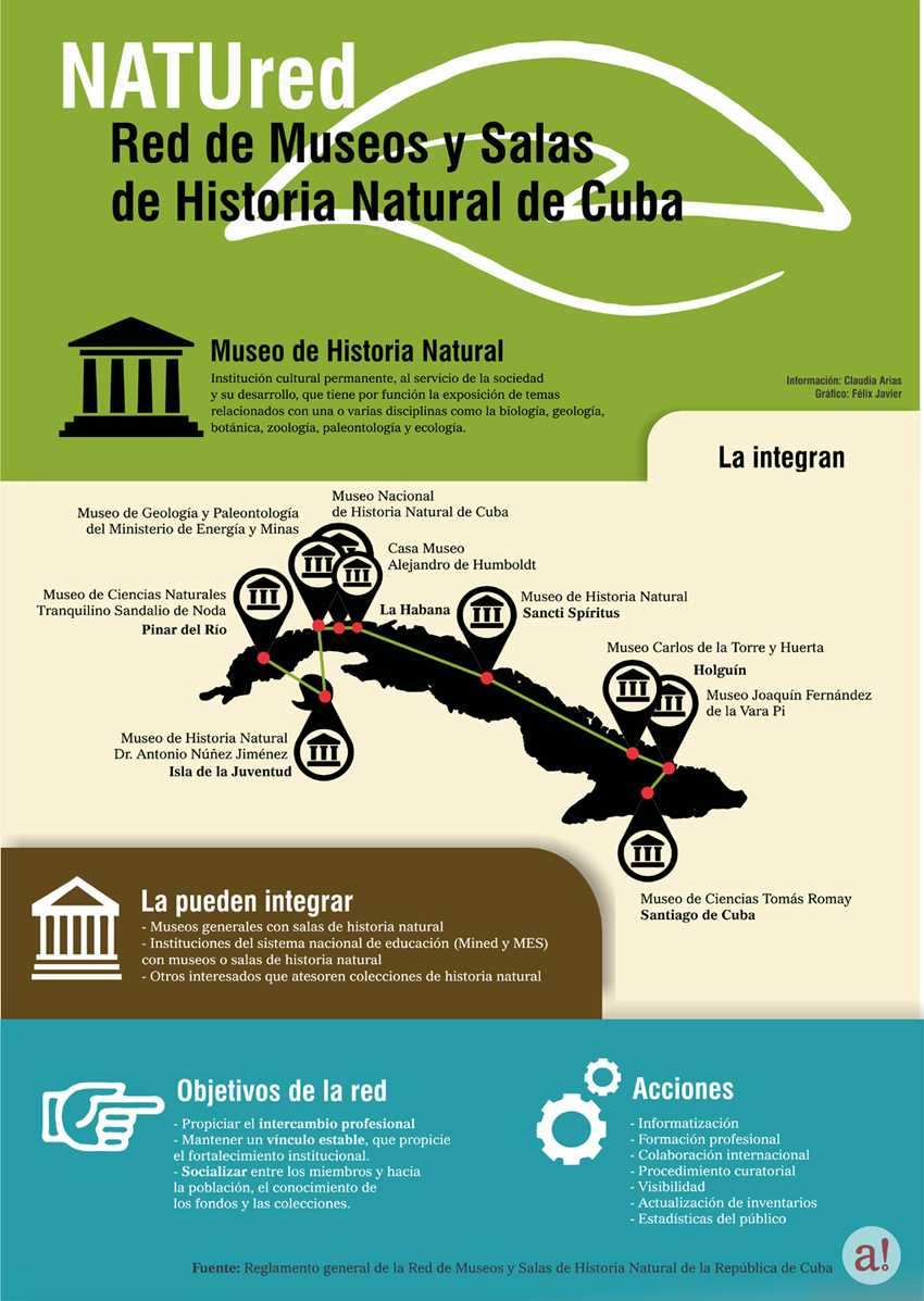 Los museos y salas de historia natural de Cuba se gestionan administrativamente desde plataformas muy diversas. Unos pertenecen al Ministerio de Cultura (Mincult), otros al Ministerio de Ciencia, Tecnología y Medio Ambiente (Citma), y algunos al Ministerio de Educación Superior (MES).