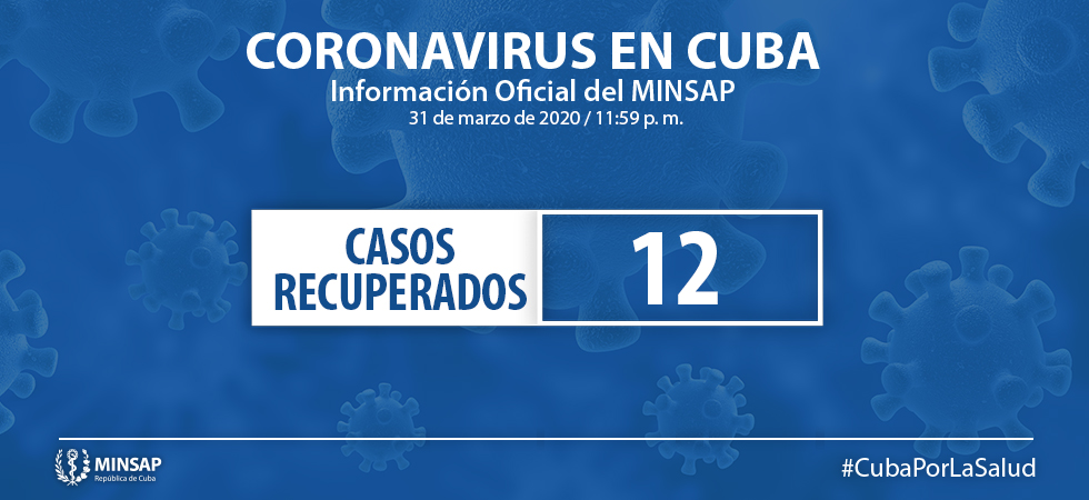 - Ciudadana cubana de 17 años de edad, residente en el municipio Encrucijada, Villa Clara. El día 28 de marzo comenzó con los síntomas. Se encontraba ingresada en el Hospital “Manuel Fajardo” por ser contacto directo de un caso confirmado anteriormente. Mantiene evolución satisfactoria hasta el momento. Se encuentran en vigilancia 13 contactos de este paciente.