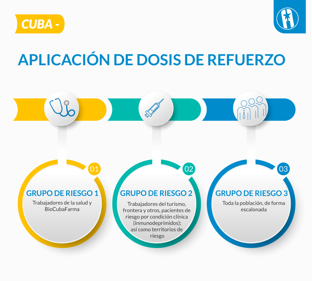 La vacunación de refuerzo en Cuba se realiza de forma escalonada, con énfasis en los grupos y territorios de riesgo. En una primera etapa se comenzó con el grupo de riesgo de los trabajadores de la salud y de BioCubaFarma, posteriormente se siguió con los trabajadores del turismo y fronteras, pacientes de riesgo por su condición clínica y por último se incluyó a toda la población. No obstante, se ha acelerado el proceso, ya que la variante ómicron se extiende por el país.