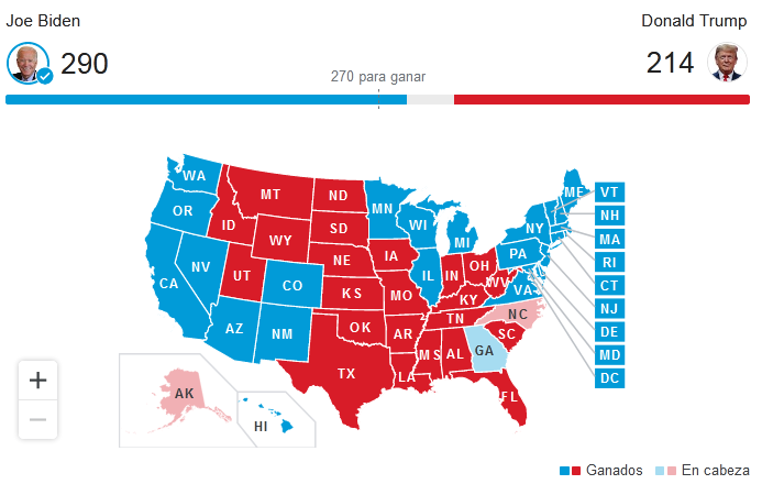 Aunque las elecciones aún no han terminado, todavía quedan cuatro estados por definirse: Arizona, Georgia, Carolina del Norte y Alaska (la agencia AP ya da a Arizona para Joe Biden).