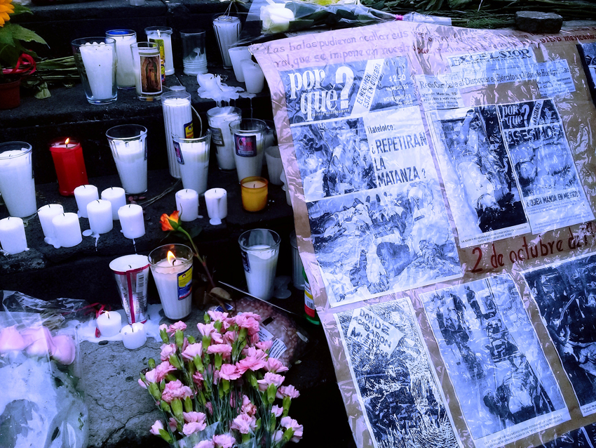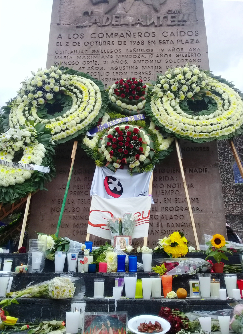 Ofrendas en la base del monumento “La Estela de Tletelolco” rinden honores a los asesinados el 2 de octubre de 1968.