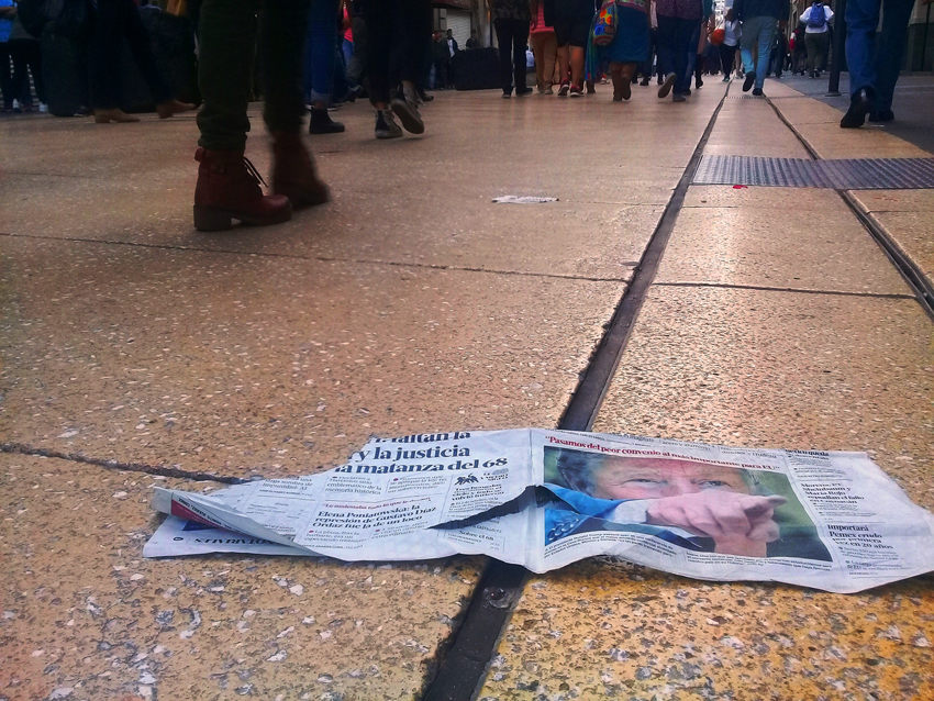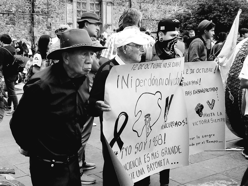 El hombre que sostiene la pancarta con recortes de periódicos tiene 76 años. Cada dos de octubre, desde hace cinco décadas, ha estado en el mismo lugar. Corrió mucho cuando en 1968 el ejército atacó la Plaza de las Tres Culturas y reprimió la manifestación estudiantil. Es uno de los sobrevivientes de la matanza de Tlatelolco.