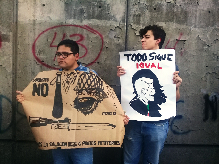 No hay edades, no hay raza, no hay clase social. Marchan ancianos, inválidos, niños, estudiantes, obreros. Surgen grafitis y carteles como señal de que todos van por el camino correcto: “Libertad”, “Ni perdón, ni olvido”, “No le temo a la represión del Estado, le temo al silencio de mi pueblo”… Muchos cuentan hasta el 43, en orden cardinal, como si los estudiantes de Ayotzinapa marcharan junto a ellos.