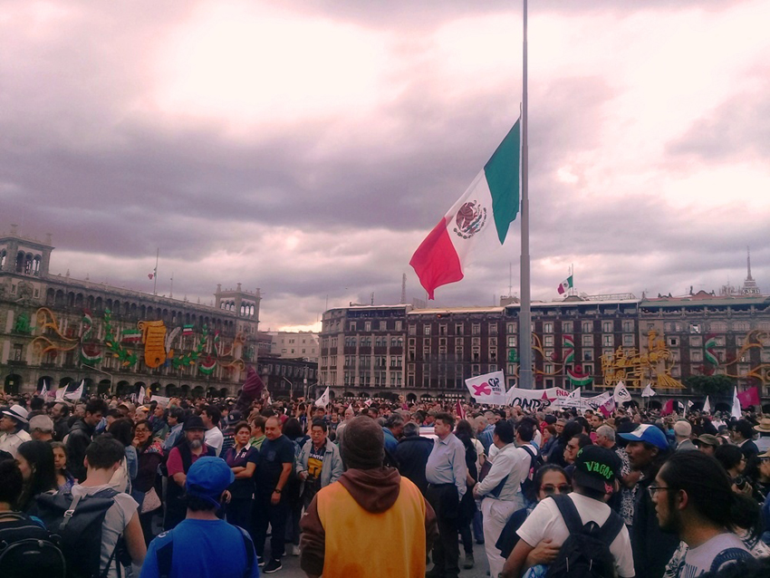 En el Zócalo todas las banderas están a media asta. Muchos manifestantes portan la enseña nacional con sus franjas roja y verde transformadas en listones negros.