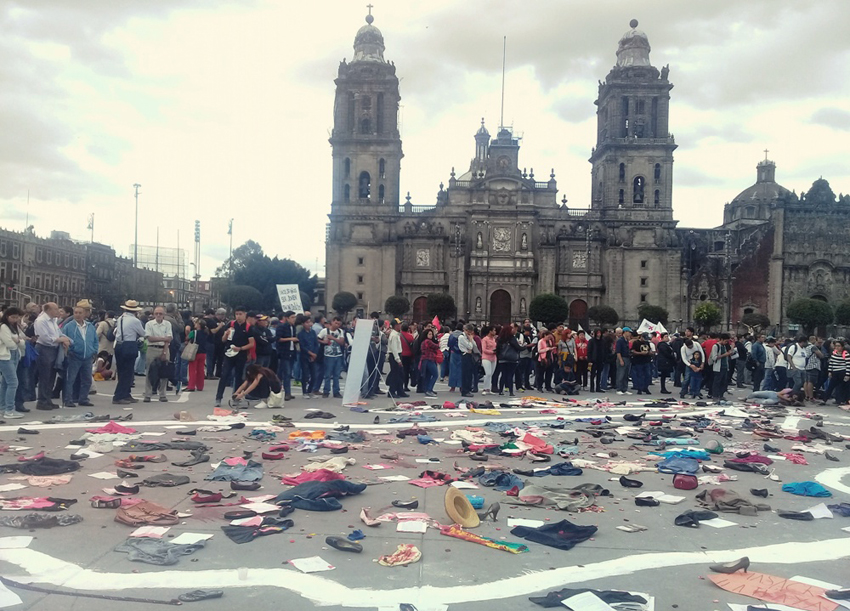 Varios participantes en el acto conmemorativo colocan ropa y zapatos al interior de un mapa de la República Mexicana (dibujado en la explanada del Zócalo) y gritan "Venceremos".