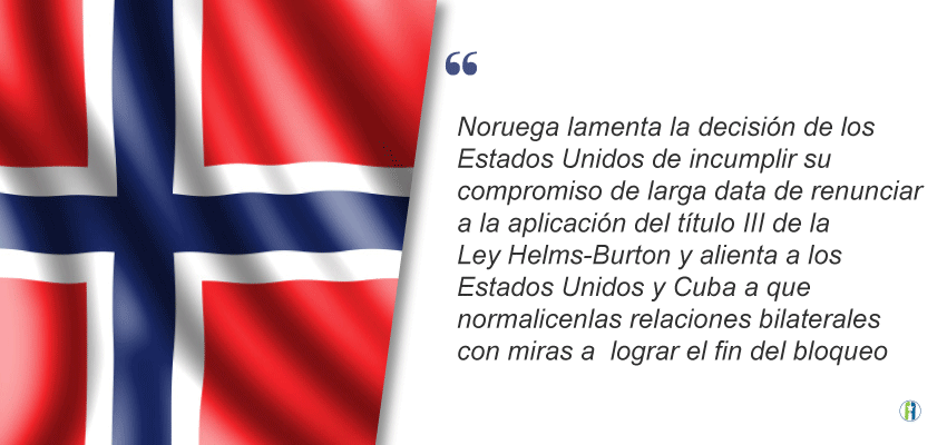 El gobierno del país escandinavo de Noruega se opuso a la aplicación extraterritorial de medidas adoptadas unilateralmente contra terceros países, de acuerdo a su apego al derecho internacional.