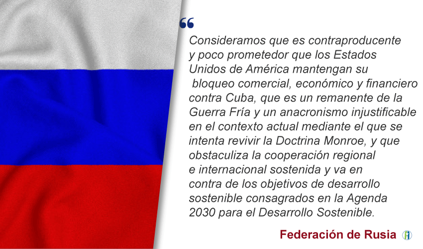 Rusia destacó su posición a favor de la eliminación del bloqueo a Cuba. En su intervención enumeró las medidas del gobierno de Trump que han constituido un recrudecimiento de esa política hostil en los últimos años, entre ellas  la imposición de numerosas restricciones financieras y la aplicación extraterritorial del título III de la Ley Helms-Burton.