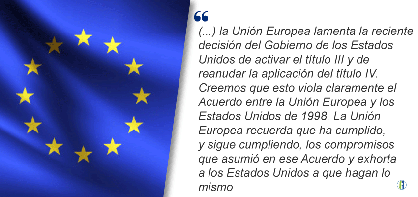 Reiteró además su profunda decepción por la decisión de los Estados Unidos de activar los títulos III y IV de la Ley Helms-Burton en abril de 2019. “Consideramos que este intento de evitar que las empresas extranjeras emprendan negocios legítimos en Cuba es ilegal con arreglo al derecho internacional y vulnera el acuerdo concertado entre la Unión Europea y los Estados Unidos el 18 de mayo de 1998”, explicó.