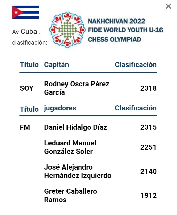 Según la página oficial, Cuba clasifica entre los diez mejores equipos del ranking pre-competencia con 2155 puntos elo, aunque aún podría restar algún conjunto por inscribirse.