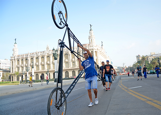 A pocos minutos de las 9:00 de la mañana, aparecieron por una de las calles que desembocan frente al Capitolio habanero, el hombre y su bicicleta gigante. Ayudándolo a transportarla y filmando todos los incidentes un grupo de colaboradores cubanos y extranjeros que inspiraban a Félix Ramón Guirola a imponer este jueves el récord Guinness de montar en la bici más alta del mundo.