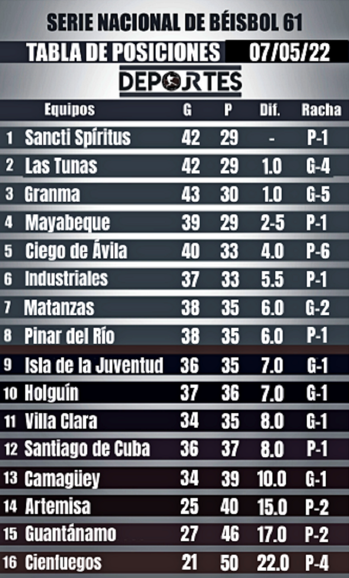 Por los otros dos cupos hay más rivalidad. Los actuales ocupantes de los escaños siete y ocho, Matanzas y Pinar del Río, respectivamente, si se imponen en los dos juegos de esta semana obligan a sus rivales a barrer para producir empates.
