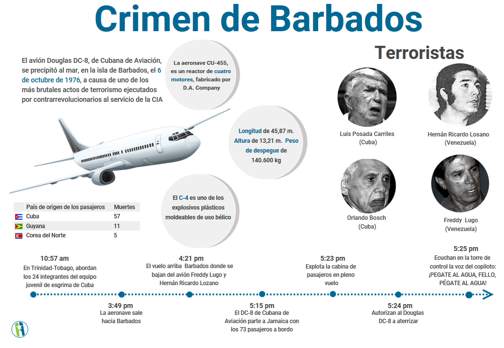 UNA FORMA MENOS CRUEL DE TRATAR TANTA CRUELDAD RESUMIDA EN UN DÍA OCTUBRE 6 OTRA COSA LA IDENTIFICACIÓN DE LA NAVE AÉREA NO ES CU-455 ÉSE ERA EL VUELO QUE CUBRÍA A LA HORA DEL SABOTAJE EL REGISTRO DE LA AERONAVE ERA CUT-1201.HONOR A NUESTROS MÁRTIRES DE BARBADOS