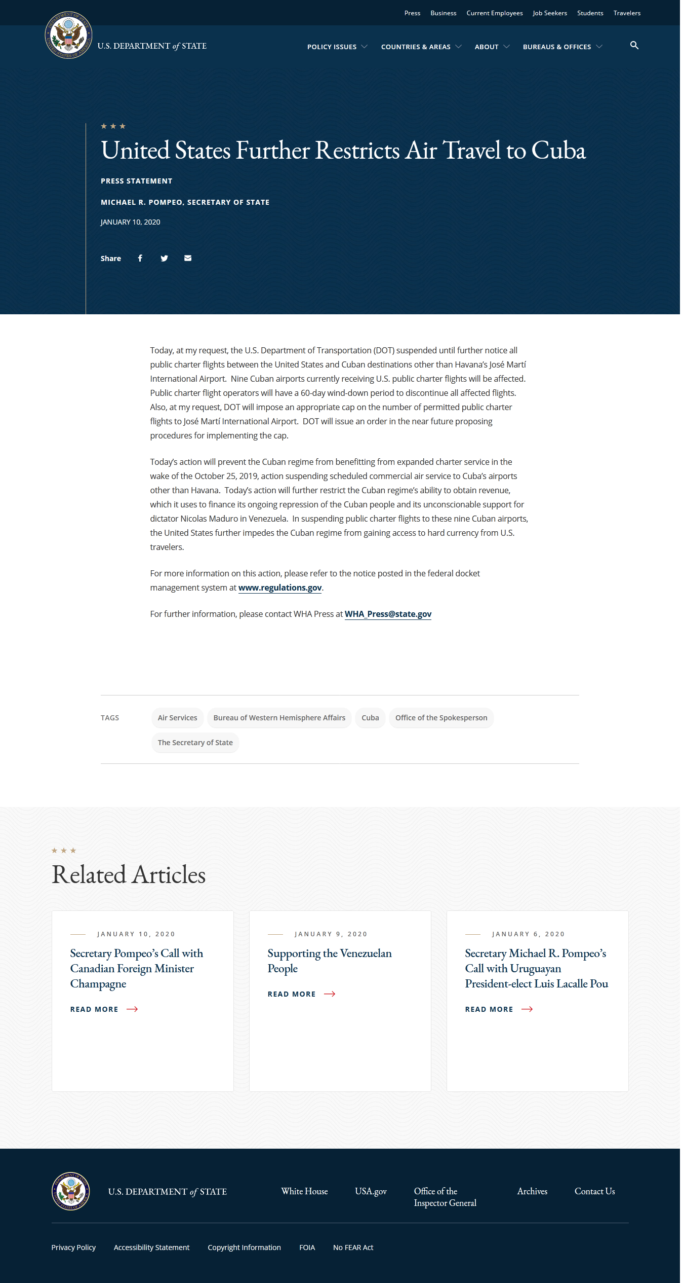 En la nota publicada en el portal digital del Departamento de Estado, Pompeo señala que “a solicitud mía, el Departamento de Transporte impondrá un tope apropiado en el número de vuelos chárter permitidos al Aeropuerto Internacional José Martí”.
