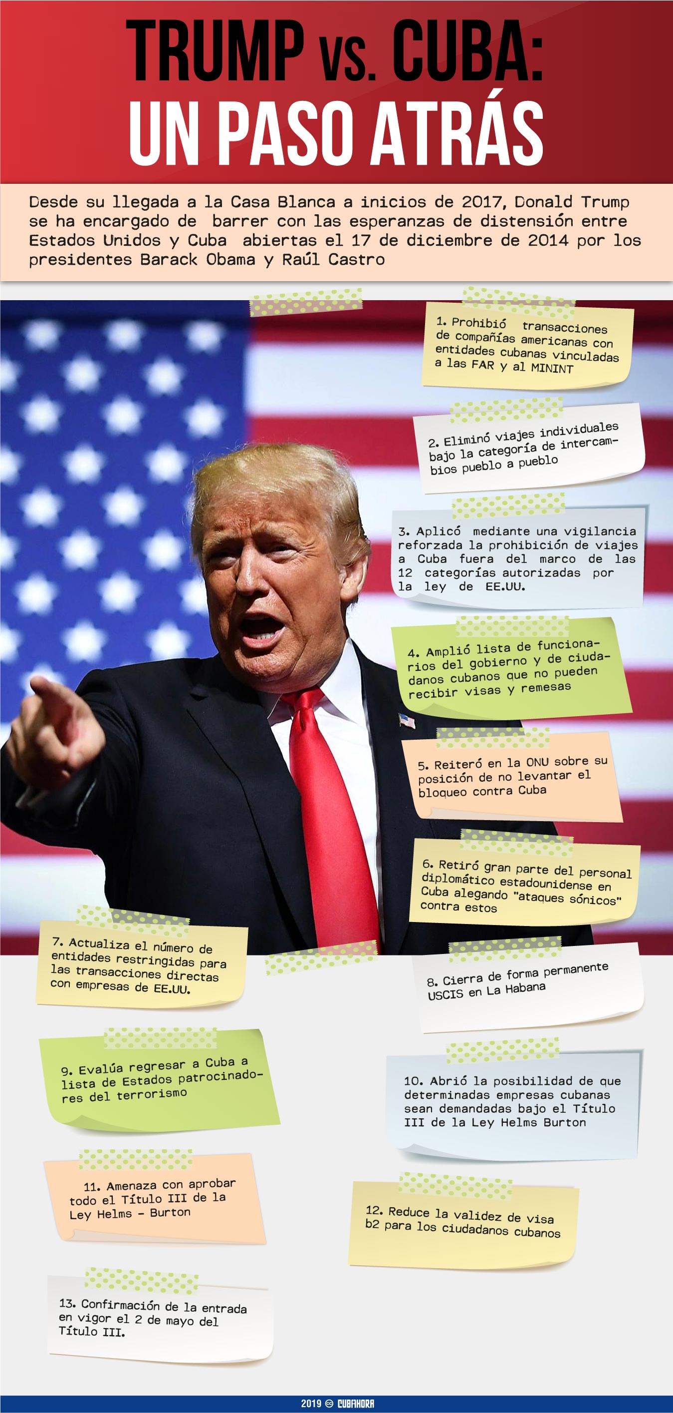 Estas acciones estarían amparadas en el extraterritorial Título III de la Ley Helms-Burton. Hasta este año, los gobiernos anteriores habían suspendido que tales hechos se lleven a cabo por un período semestral, sin embargo, a partir del 16 de enero de 2019 se comenzó a reducir por plazos, primero por 45 días y luego por 30.