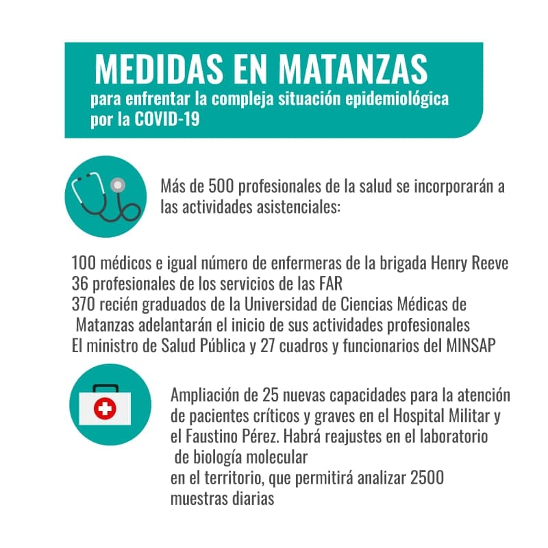 Igualmente, han llegado, procedentes de otras provincias y de los servicios médicos de las Fuerzas Armadas Revolucionarias, 205 médicos y 330 enfermeras; y se ha logrado incrementar el número de camas hospitalarias que se encuentra en 1296, de las cuales 1054 son para atender a pacientes de COVID-19 y 105 para pacientes graves. En el caso del segundo se pretende alcanzar en un proceso de despliegue una capacidad de atención de 120 camas para los pacientes graves.
