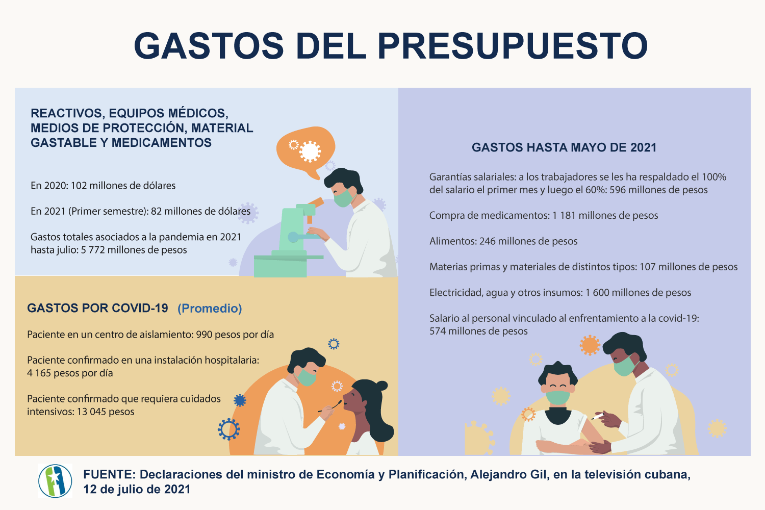 Así lo explicó el ministro de Economía y Planificación, Alejandro Gil Fernández. Este acotó que esos gastos se realizan en un contexto de disminución de los ingresos percibidos, por ejemplo, a causa de la disminución del turismo y las medidas de recrudecimiento del bloqueo.