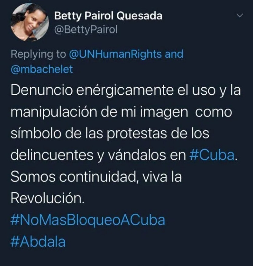 El problema fue que ella no protestaba contra el gobierno sino contra el bloqueo estadounidense. Betty Pairol, que es el nombre de esta joven abogada cubana, estaba en las calles para apoyar a la revolución y el uso de su rostro la indignó tanto que denunció a través de twitter a Michelle Bachelet y a la misma ONU de usar indebidamente su imagen. A las pocas horas su cuenta en la red social fue suspendida.