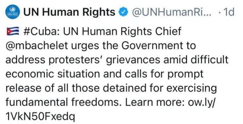 El fervor que estaba generando en Miami y Latinoamérica estas manifestaciones llegaron a la misma Alta Comisionada de Derechos Humanos de la ONU, Michelle Bachelet, que lanzó un tuit de apoyo a las protestas junto a la imagen de la mujer que levantaba la bandera de Cuba en sus brazos y una intensa pasión expresada en su rostro. Los colores, el encuadre, su gesto, convertían a la mujer en una gran representación de las protestas.