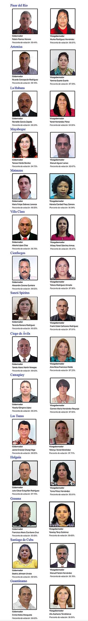De acuerdo con estos datos y como establece la Ley 127 "Ley Electoral" en su artículo 249.1, al alcanzar más de la mitad de los votos válidos emitidos resultaron electos para los cargos de Gobernador y Vicegobernador los siguientes compañeros: