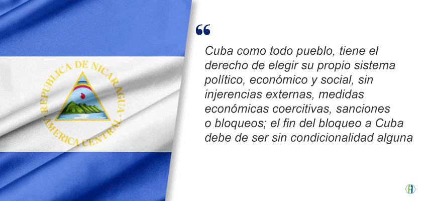 El gobierno nicaragüense fue otro de los que reiteró su apoyo a Cuba contra el bloqueo. Subrayó que tal política “afecta de manera negativa y de manera injustificada la economía cubana, su derecho al desarrollo y el pleno disfrute de todos los derechos humanos del pueblo de Cuba constituyendo el mayor obstáculo para la implementación de la Agenda 2030 para el Desarrollo Sostenible y sus Objetivos, provocando pérdidas y dañando las relaciones financieras y crediticias internacionales de Cuba”.