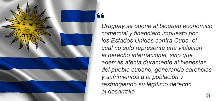 El país sudamericano de Uruguay en su intervención sobre el cese del bloqueo exhortó a ambas partes (Cuba y Estados Unidos) a reiniciar el diálogo que permita avanzar hacia la solución de los problemas pendientes.