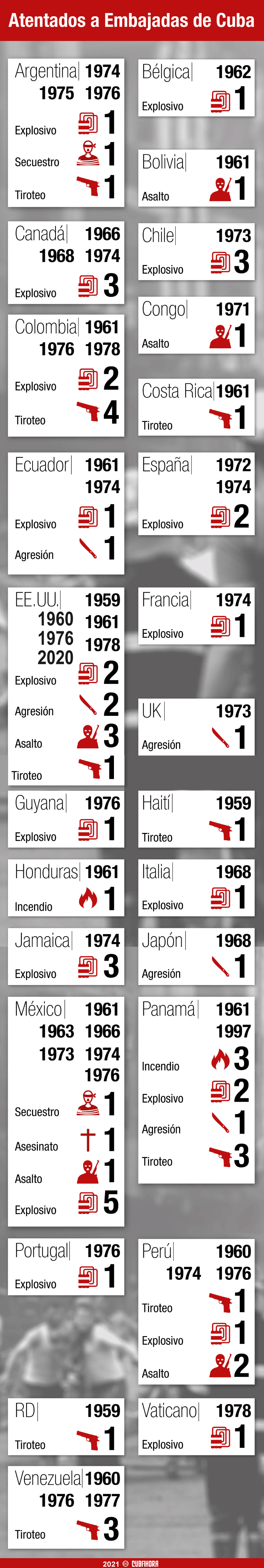 Así, este ataque a la Embajada cubana en Estados Unidos se sumaba a la larga lista de atentados contra las embajadas, consulados, servicios y personal diplomático de Cuba en el exterior. Se tiene constancia también de que en el caso de nuestro país los atentados sufridos están relacionados directa o indirectamente con acciones provenientes de los EE.UU.