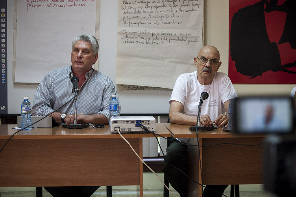 Miguel Díaz Canel, miembro del Buró Político del Partido y Antonio Moltó, Presidente Nacional de la Upec, sostuvieron un debate con los participantes del II Encuentro Nacional de Jóvenes Periodistas. (Foto: Fernando Medina / Cubahora)