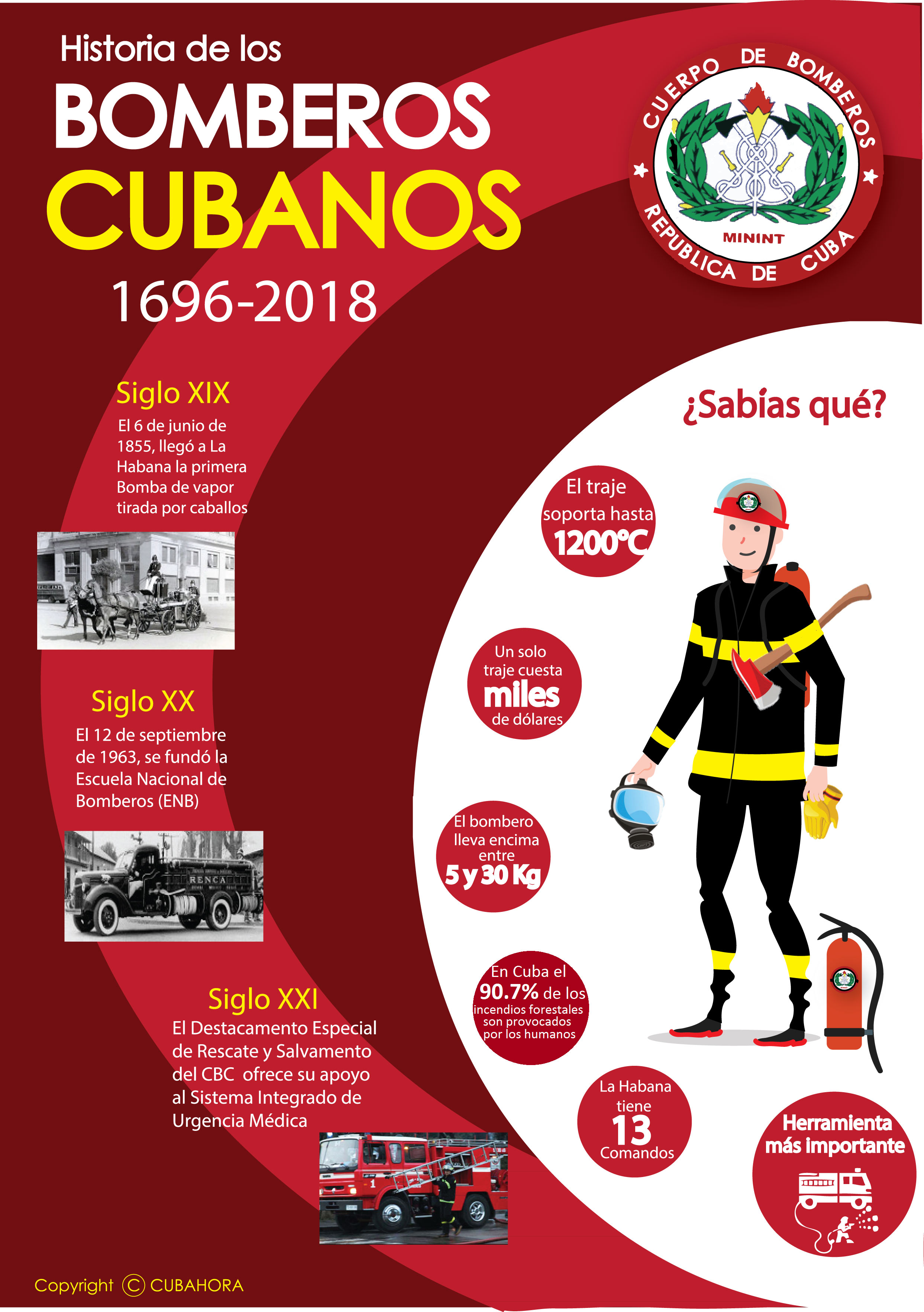 Lo que el 13 de noviembre de 1696, fecha que se marca como el nacimiento oficial del Cuerpo de Bomberos de Cuba (CBC), se consideraba un rudimentario grupo de apagafuegos en un país que no había logrado su independencia de la metrópoli española, hoy se ha fortalecido y organizado como un sistema de entidades que se subordinan directamente al Estado, con la indispensable coordinación de las fuerzas del Ministerio del Interior.