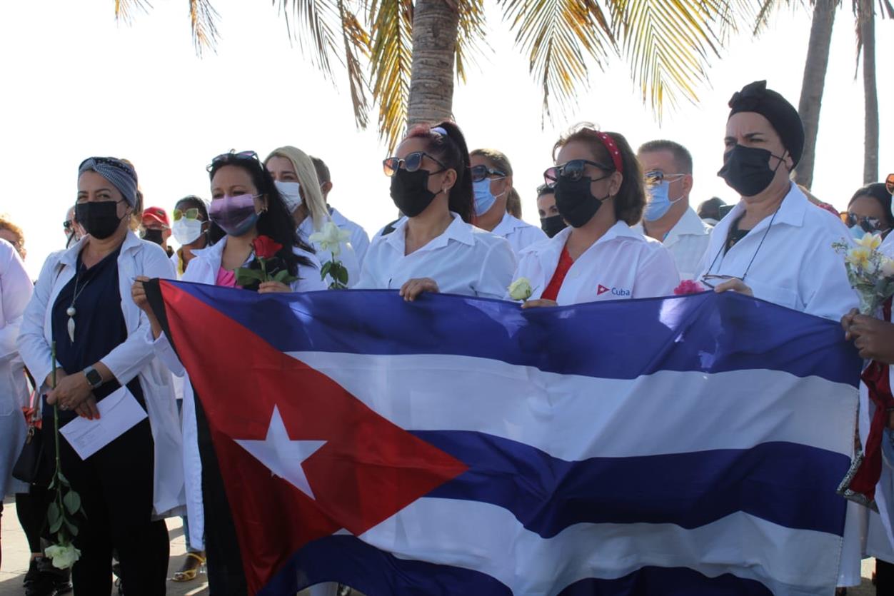 Después de la jornada laboral, al malecón nos fuimos todos con flores de diversos tamaños y colores. Blancas, rojas o amarillas, rosas o marpacíficos adornaban aquel lugar que en las manos de un grupo de arropados por batas blancas, evidentemente cubanos, atraían la mirada de todo transeúnte. Una goleta, un barco mercante, los cuervos, el océano y el ardiente sol… atestiguaron.