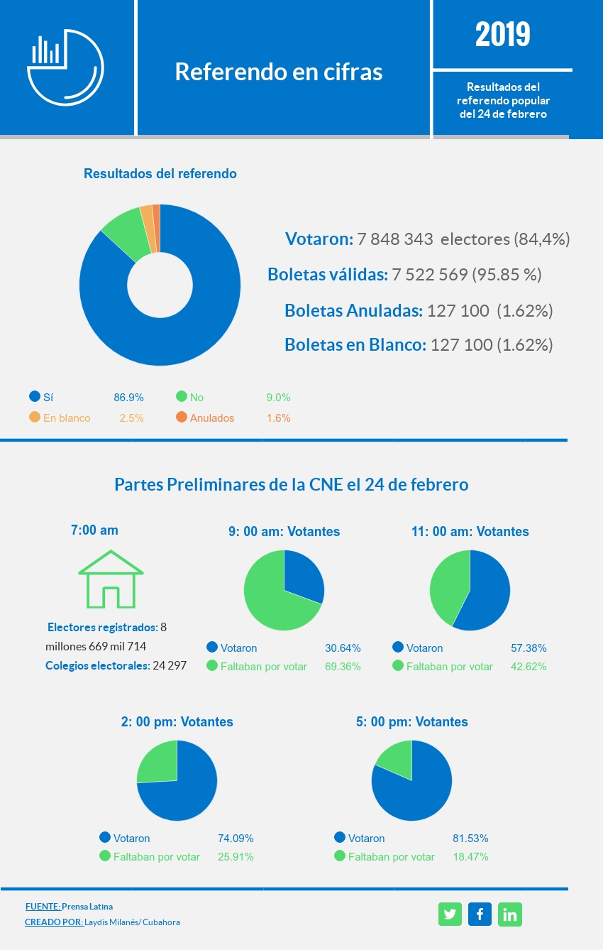 Terminada la votación e informados los resultados preliminares, por la Comisión Electoral Nacional se anunció que fue ratificada la nueva Constitución de la República de Cuba, por el voto favorable de la mayoría de los ciudadanos con derecho electoral, en Referendo convocado para el 24 de febrero del 2019.