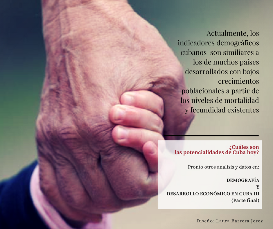 “En lo que pudiera definirse como la última etapa de la transición [demográfica] y uno de sus efectos principales, se presenta el envejecimiento de la población; sin duda el principal problema demográfico de Cuba en la actualidad, y también con perspectiva futura, dada sus implicaciones económicas, sociales, etc. A fines del siglo pasado el 14 por ciento de la población tenía 60 años y más, para la actualidad, alcanza el 15,4 por ciento. Este comportamiento, singular y de cierta forma inédito en el contexto de los países de América Latina caracteriza una transición demográfica muy avanzada, en la cual la fecundidad, como principal variable demográfica actuante en el crecimiento de la población, ha tenido una disminución significativa, que para muchos ha sido de las más intensas a nivel internacional, lo cual también ha caracterizado la evolución de la mortalidad”, según Alfonso Fraga.