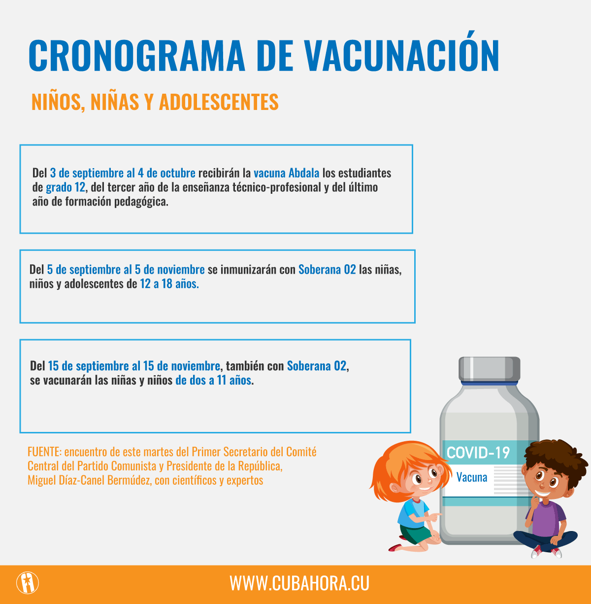 En primer lugar, es importante resaltar que todos los niños, niñas y adolescentes serán vacunados totalmente antes de empezar el curso de manera presencial. La estrategia de vacunación que se desarrolla previa al inicio del curso escolar concibe la aplicación de las tres dosis y la utilización en determinados casos de Abdala y en otros, Soberana 02.