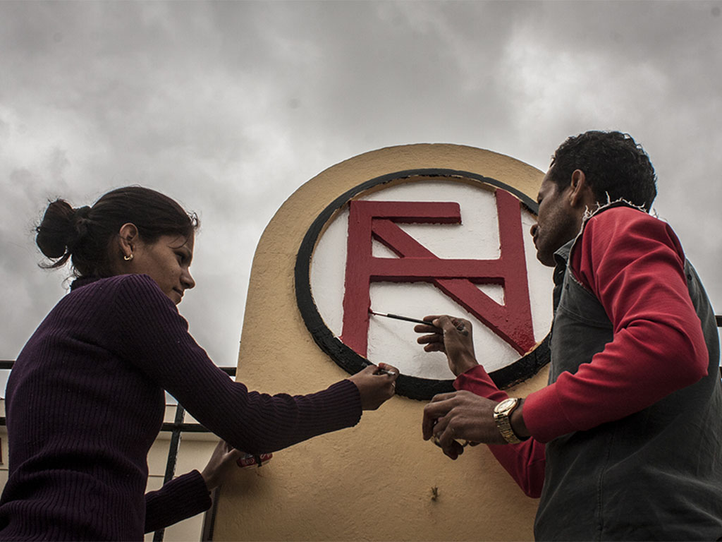 El diseñador y muralista  Luis Miguel Jiménez Rodríguez ha sido la mano detrás de los colores que resaltan las chapas de botellas de cervezas, algunas  ya desaparecidas, pero que alcanzaron gran renombre. Cuenta que personas mayores, vecinas del lugar, les han dicho que  nunca se había hecho tal obra, ni siquiera en su inauguración. Luis habla con satisfacción pues es uno de los trabajos más interesantes y exigentes que ha enfrentado y reconoce la importancia de la historia. También habla con orgullo de su joven hija Sheila Jiménez Alfonso que lo acompaña en la obra. Graduada de Bibliotecología,  Sheila labora con Luis, desde bien pequeña,  en las encomiendas que él realiza como trabajador de la cooperativa. De niña, dice,  le agarraba los pinceles al padre y actualmente también pinta en lienzos. Hoy, subida en los andamios, de trazo en trazo nos habla de la satisfacción que siente al seguir sus pasos.