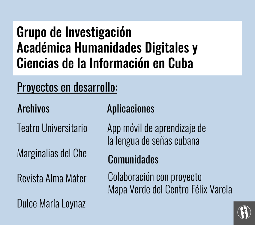 En un primer momento se dedicaron a la memoria histórica, la digitalización y la gestión de datos abiertos y de recursos de información para el desarrollo. “Hemos trabajado en digitalizar y restaurar el fondo del Teatro Universitario, la biblioteca personal del Che, la revista Alma Mater, entre otros archivos. Además, nuestro proyecto trata de que los productos partan como resultados de investigaciones. Participamos en eventos científicos, y también como parte de este se producen tesis y artículos científicos. Por ejemplo, una tesis de grado vinculada al proyecto es la realización una aplicación para el aprendizaje de la lengua de señas cubana”, comenta la estudiante de Ciencias de la Información, Rosányelin Egec Montero.