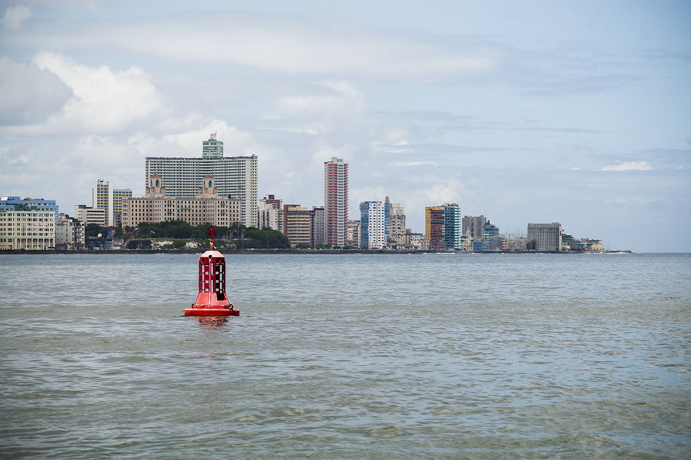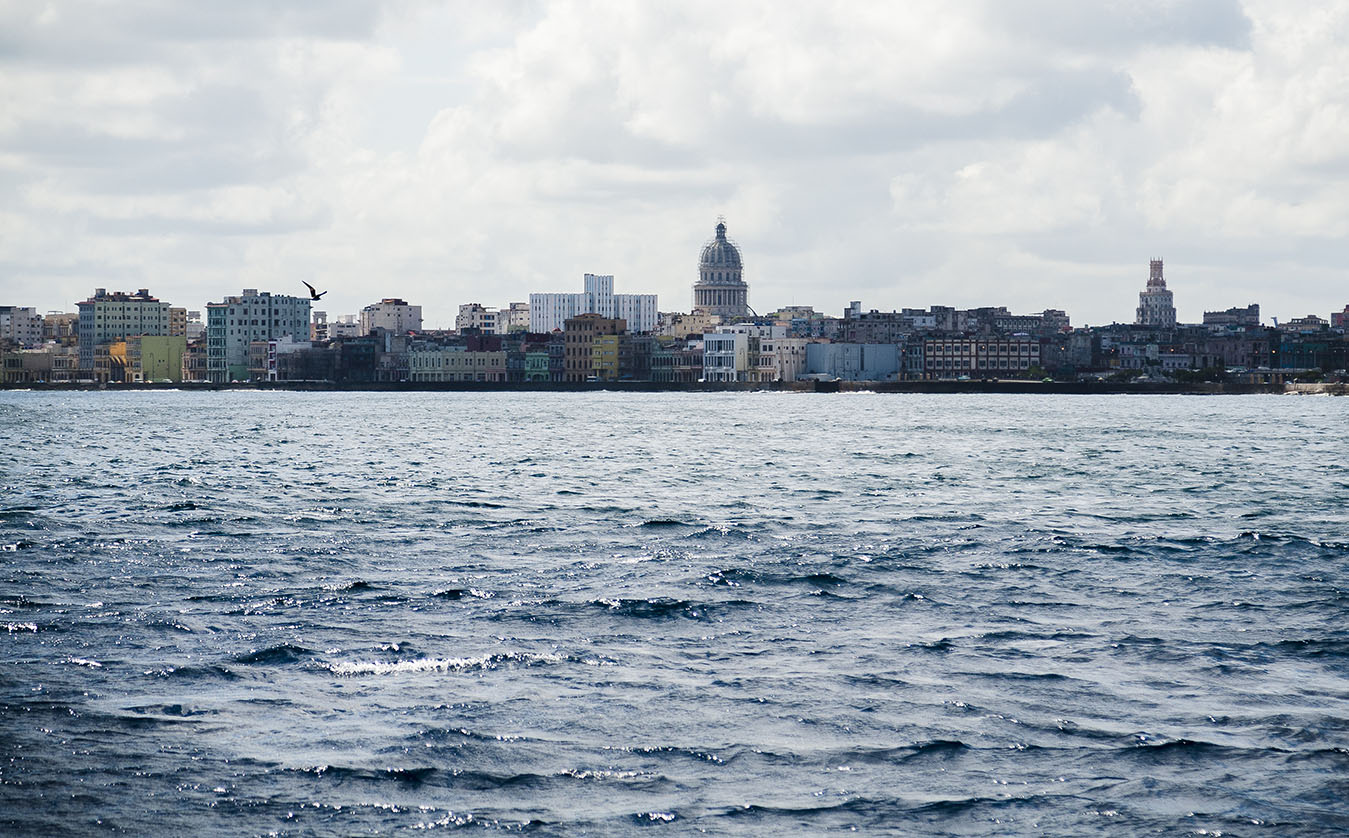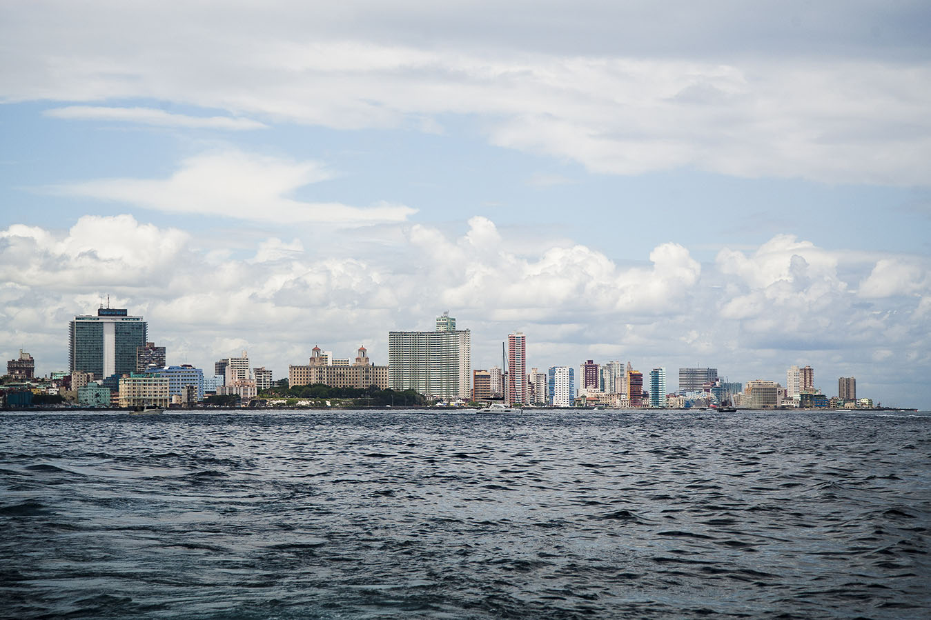 Recientemente, nuestro fotorreportero Fernando Medina, tuvo la oportunidad de capturar algunas instantantes de la ciudad desde una posición privilegiada: el mar. Resaltan los edificios y esa larga línea que forman en todo el horizonte, el malecón, el Castillo del Morro y el panorama de restauración y construcción de nuevas infraestructuras, síntomas del desarrollo gradual de nuestro país.