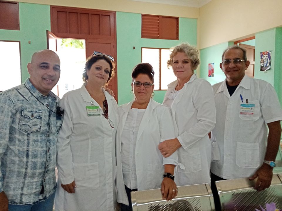 Hermanas de la Caridad junto al representante de OPS-OMS en Cuba, Dr. José Moya (a la izquierda), y el director del hospital, Dr. Rolando Montero (a la derecha). (Foto: OPS en Cuba)