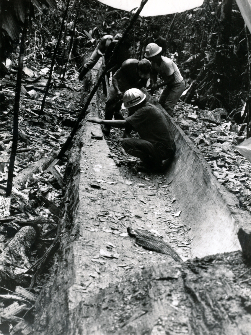 ”Una vez que ya está listo este proceso, viene el traslado de las canoas hacia las playas, lo que también fue otra odisea. Lenin era un hombre robusto, fuerte y era un poco el que garantizaba y pasaba la prueba de control porque se subía previamente a la canoa y él era un poco el que hacía la prueba de resistencia de dichas canoas. Finalmente las bajan a través de todo un periplo desde la selva hasta llegar a las playas de los ríos, donde se hace la comprobación de la flotabilidad de las canoas”.