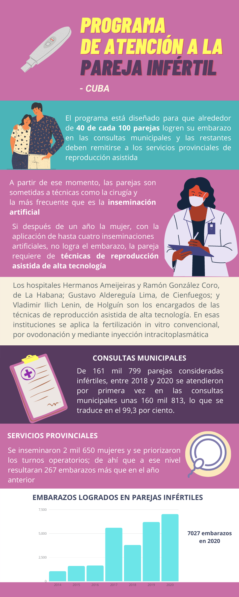 El programa, creado en 2016, ha identificado según datos del Ministerio de Salud Pública a 166 mil 631 parejas infértiles y en 2020 a unas 25 mil 409. De ellas unas 4 mil 832 no desearon recibir tratamiento.